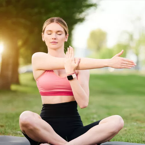 Start by bringing your right arm up and across your chest with your hand gently resting on your left shoulder, or use your left hand to support your arm by the elbow.