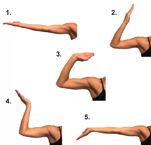 Stand straight with your arm at your side, palm facing to the back. Bend your wrist so your palm faces the ceiling.